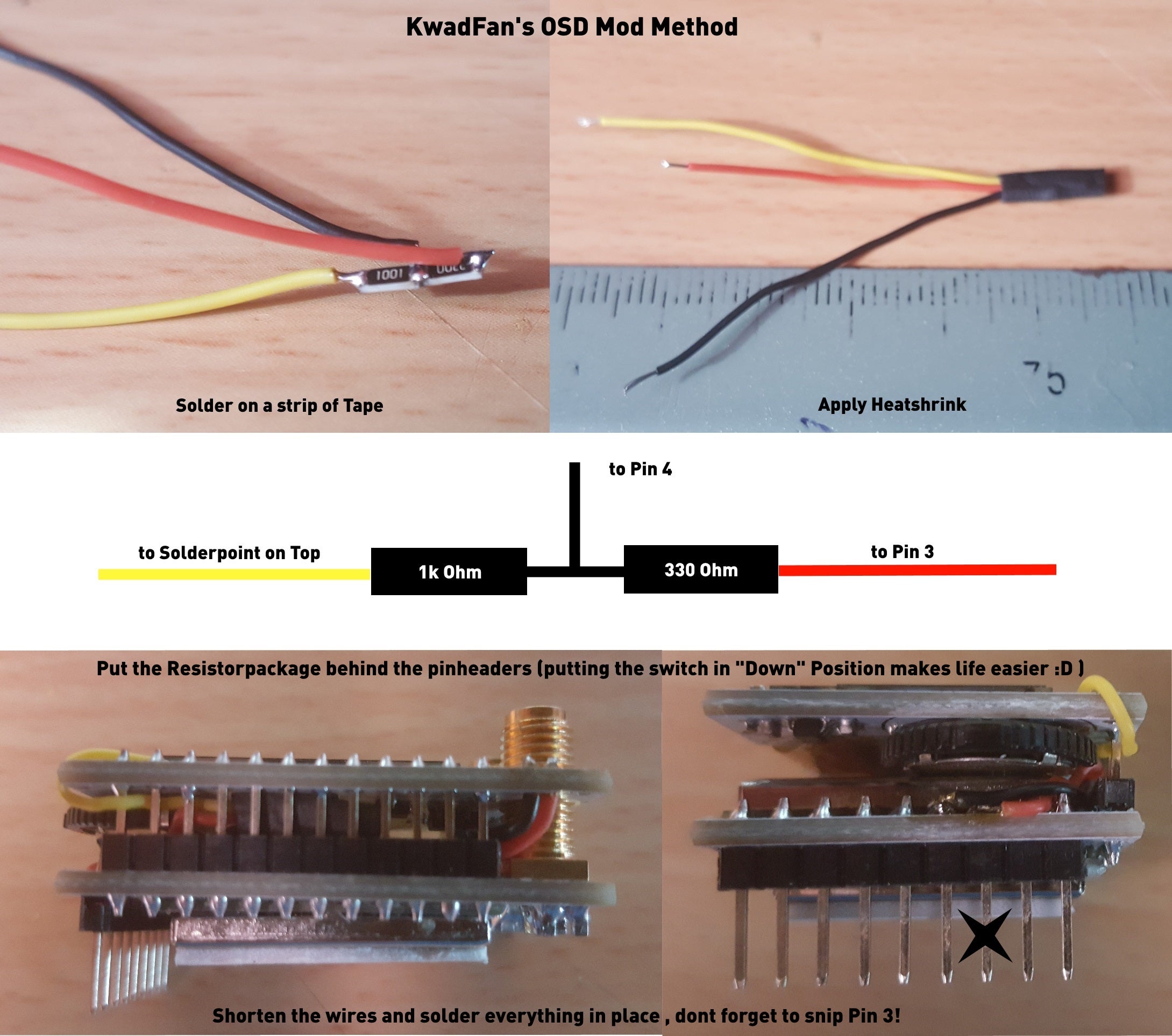The OSD needs Two resistors. a 820 ohm and 240 ohm also a tiny cable furthermore pin3, counted from the upper position, has to be removed (cut), preferable size for crystal clear installation is SMD sizes (1206 or 0805) or normal size resistor (classic size not SMD) , while the OSD is enabled the Fatshark Button will be disabled.
